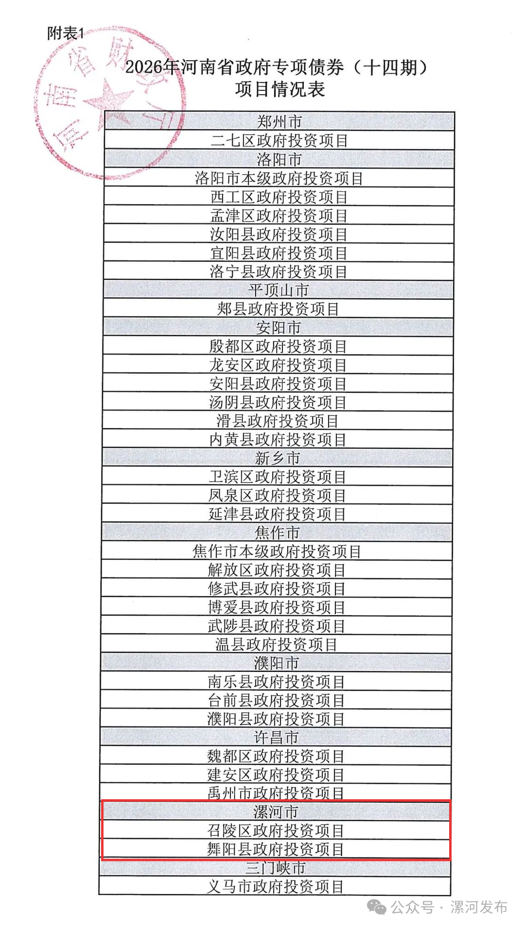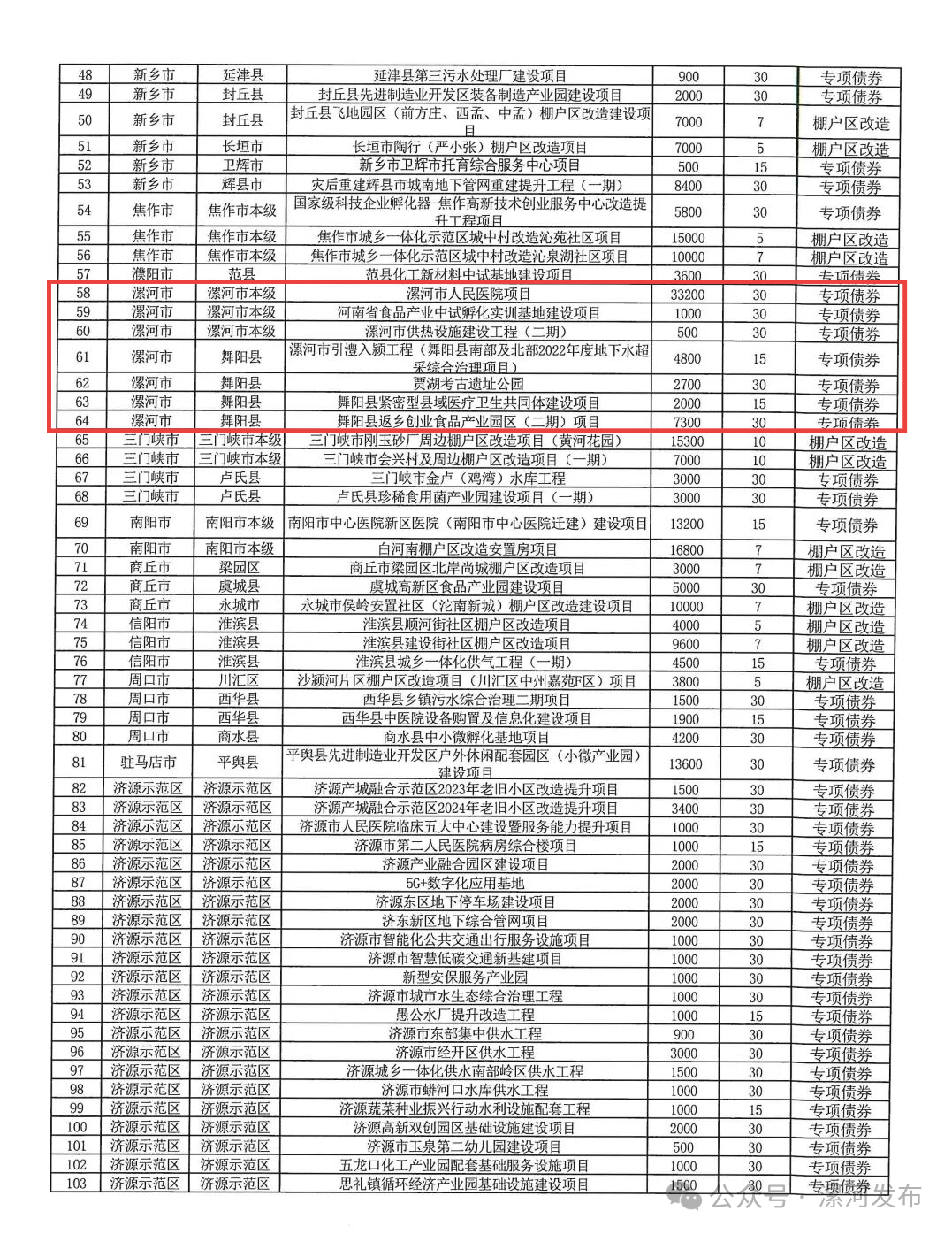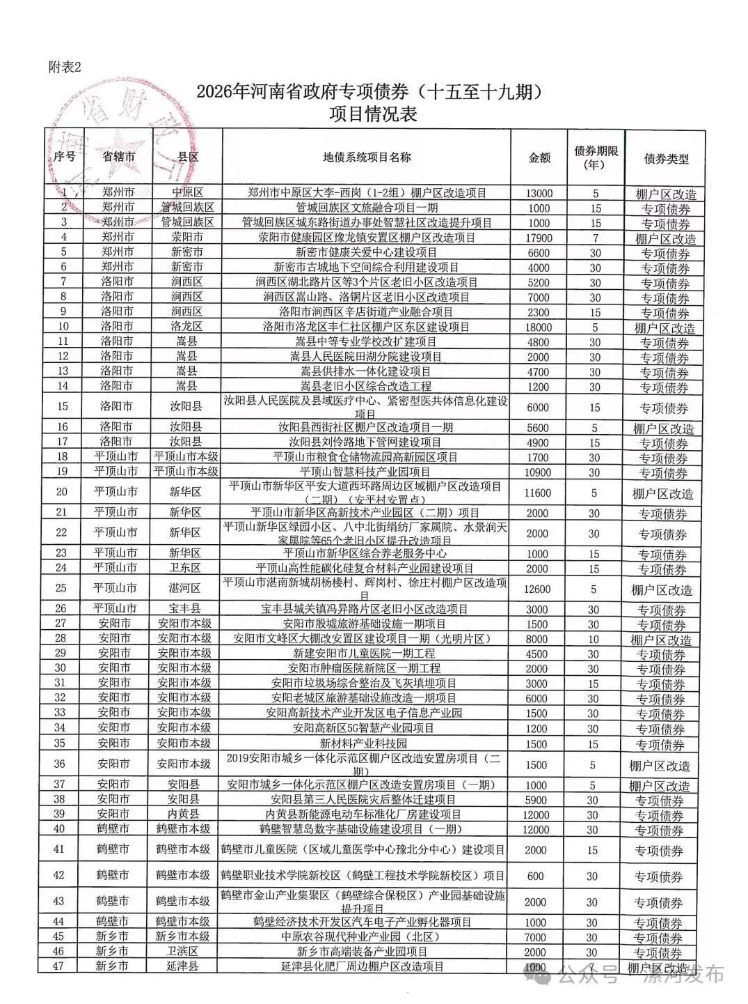 2026年河南省政府专项债券(十五至十九期),用于项目建设,详见下表: